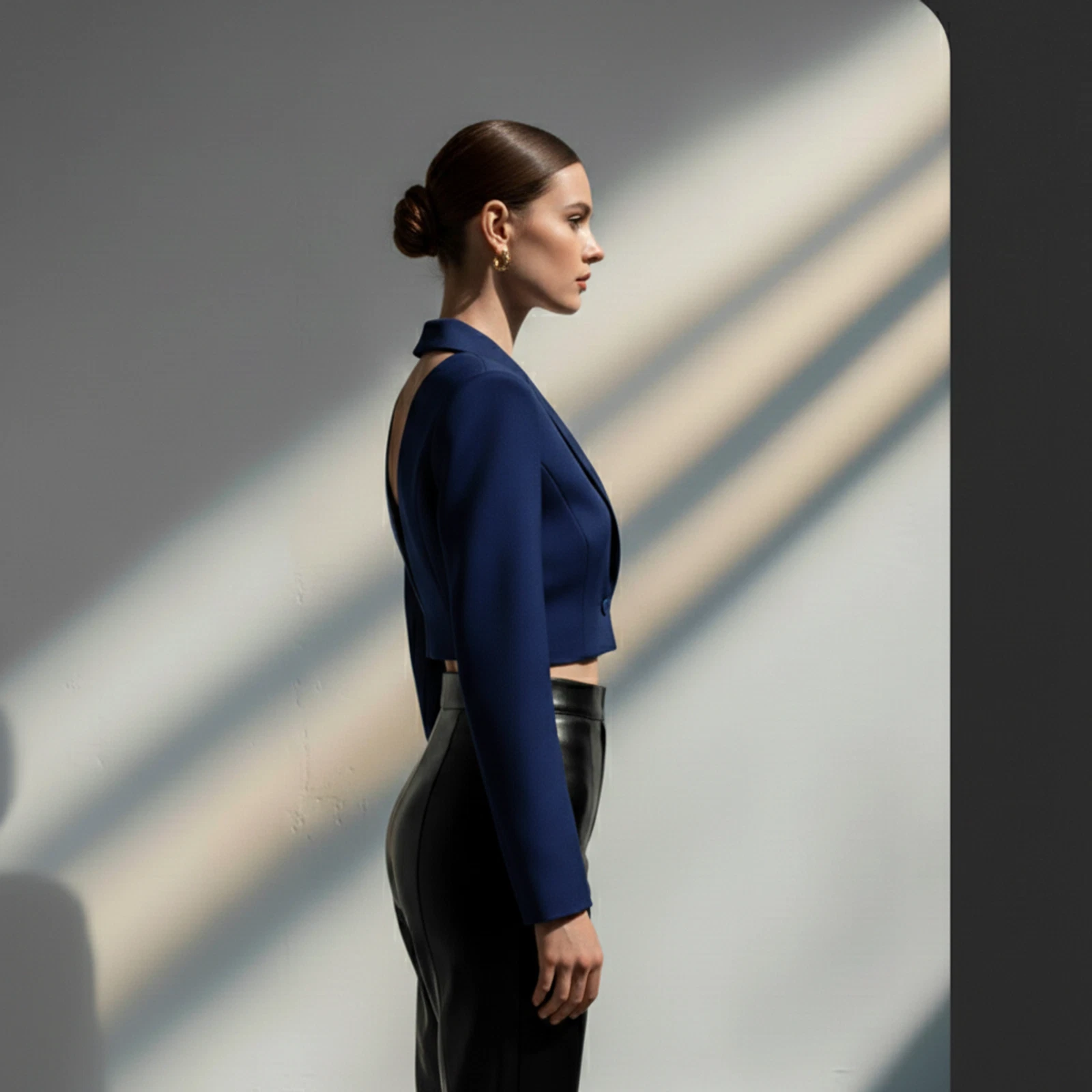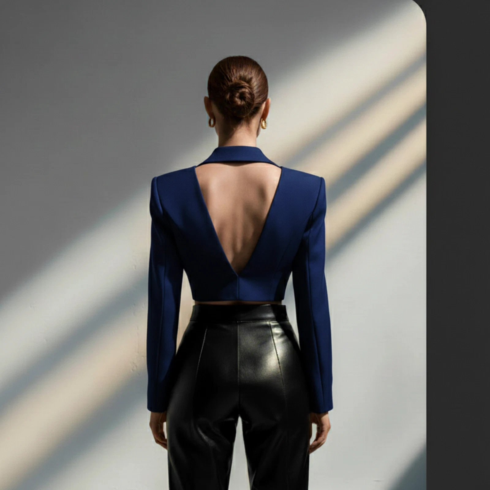 Erőteljes vállvonal, mély hátrész kivágás és precíz szabás – egy ikonikus, modern couture blézer kompromisszumok nélkül.