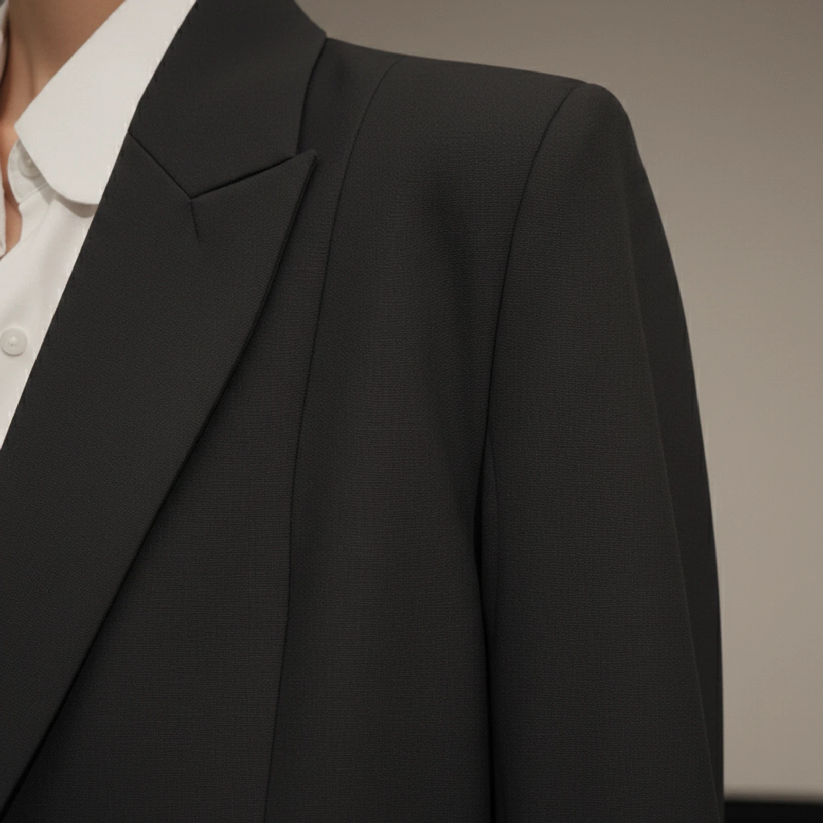 Markáns vállvonal, derékszűkített szabás és strukturált, széles öv – modern hatalom szoborszerű formában.